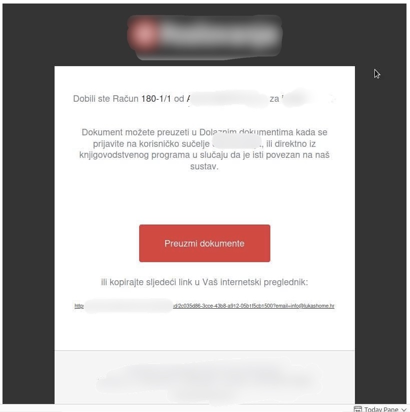 Riječ je o porukama koje izgledaju kao legitimne obavijesti o zaprimljenom dokumentu, najčešće računu ili otpremnici te sadrže gumb poput „Preuzmi dokumente“. Vizualno su vrlo uvjerljive i na prvi pogled ih je teško razlikovati od stvarnih poruka koje građani i poslovni subjekti svakodnevno primaju.