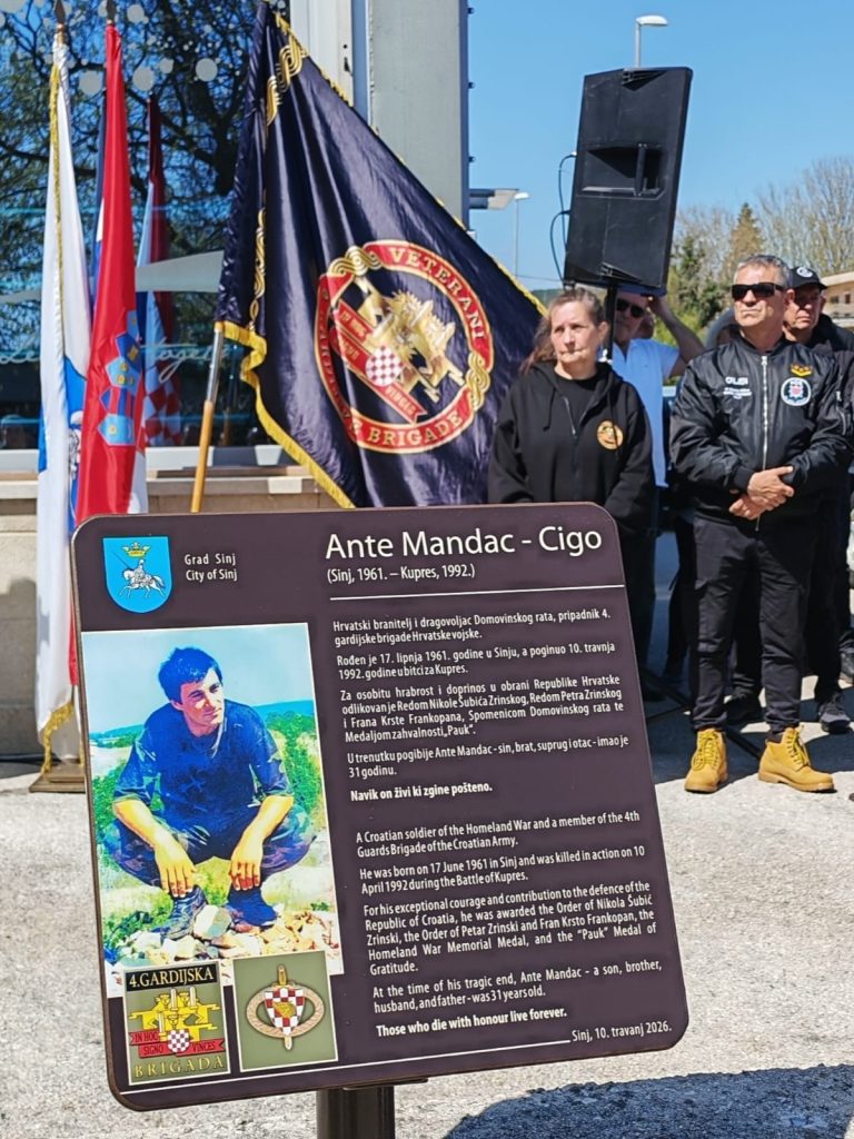 U Sinju je jutros svečano otvorena Ulica hrvatskog branitelja Ante Mandaca – Cige, uz otkrivanje spomen-ploče u njegovu čast. Svečanost je organizirao Grad Sinj kao trajno sjećanje i uspomenu na poginulog hrvatskog branitelja koji je život dao za slobodu Republike Hrvatske.